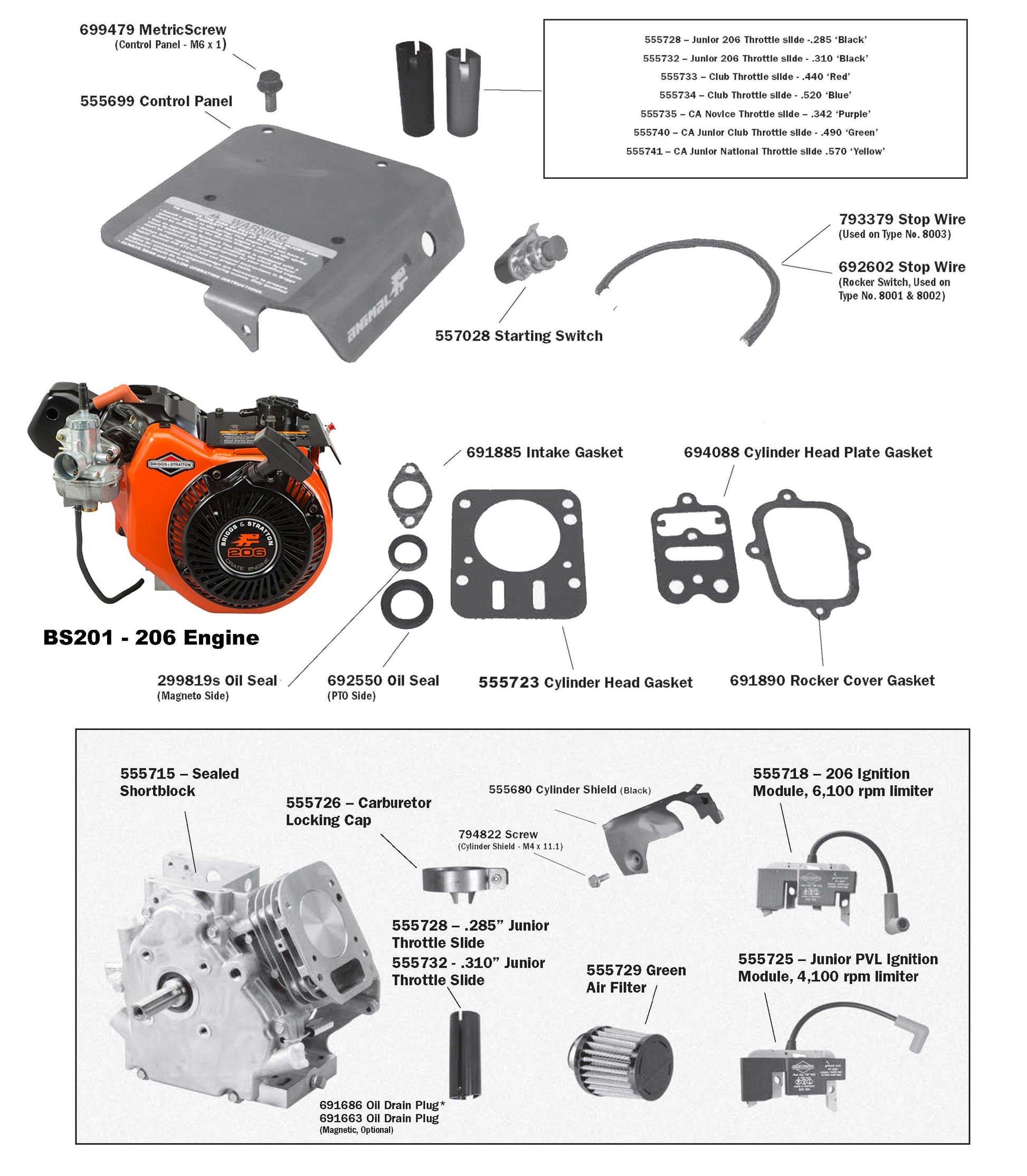 Blue - The blue 206 slide is another slide used for the Junior 206 class, depending on the track (.520") Usage of this slide requires a locking cap (#555726) on the carburetor top cap. Junior 2 LEGACY.
